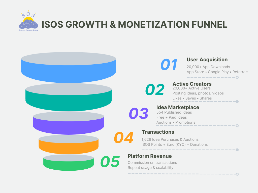 ISOS is a global mobile social network transforming ideas into tradeable digital assets. The platform enables creators to share ideas, receive donations, and sell concepts directly, while ensuring blockchain-backed ownership and transparent monetization. With 20,000+ organic users and referral-driven growth, ISOS focuses on the global creator economy, providing a platform that supports and enhances the work of creators worldwide, connecting creators, investors, and businesses in a secure, human-first ecosystem where ideas have measurable value and protected authorship.